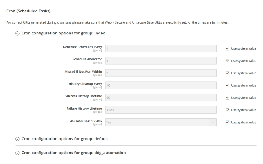 All the presented Cron jobs belong to the index group. The work of the Cron job group can be set up here, Stores -> Advanced -> System: