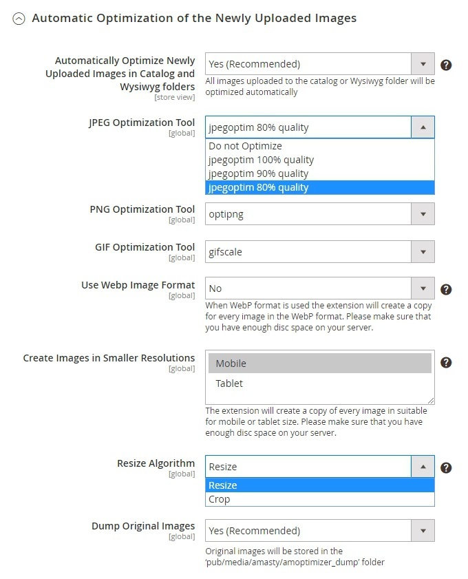 If you set Optimize Images to YES, you’ll compress the images and speed up the page loading with no harm to the image quality. This is possible due to a range of flexible settings available, such as Automatically Optimize Images in Catalog or Wysiwyg folder, JPEG optimization tool, PNG optimization tool, GIF optimization tool, Use Webp image format, Create Images in Smaller Resolutions and more.