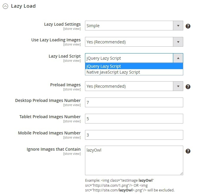 The tool makes it possible to choose the image loading option that suits your e-store best. For instance, Use Lazy Loading Images = Yes activates delayed image loading. The images appear only when a user scrolls to them, which speeds up the page loading.