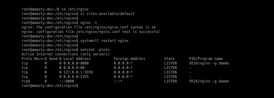 Reload the configuration for your web server (Apache or Nginx respectively): #sudo systemctl reload apache2 #sudo systemctl restart nginx After that test your web server once again using netstat command: #netstat -plntu and check if it’s working with the non-default HTTP port 8080: