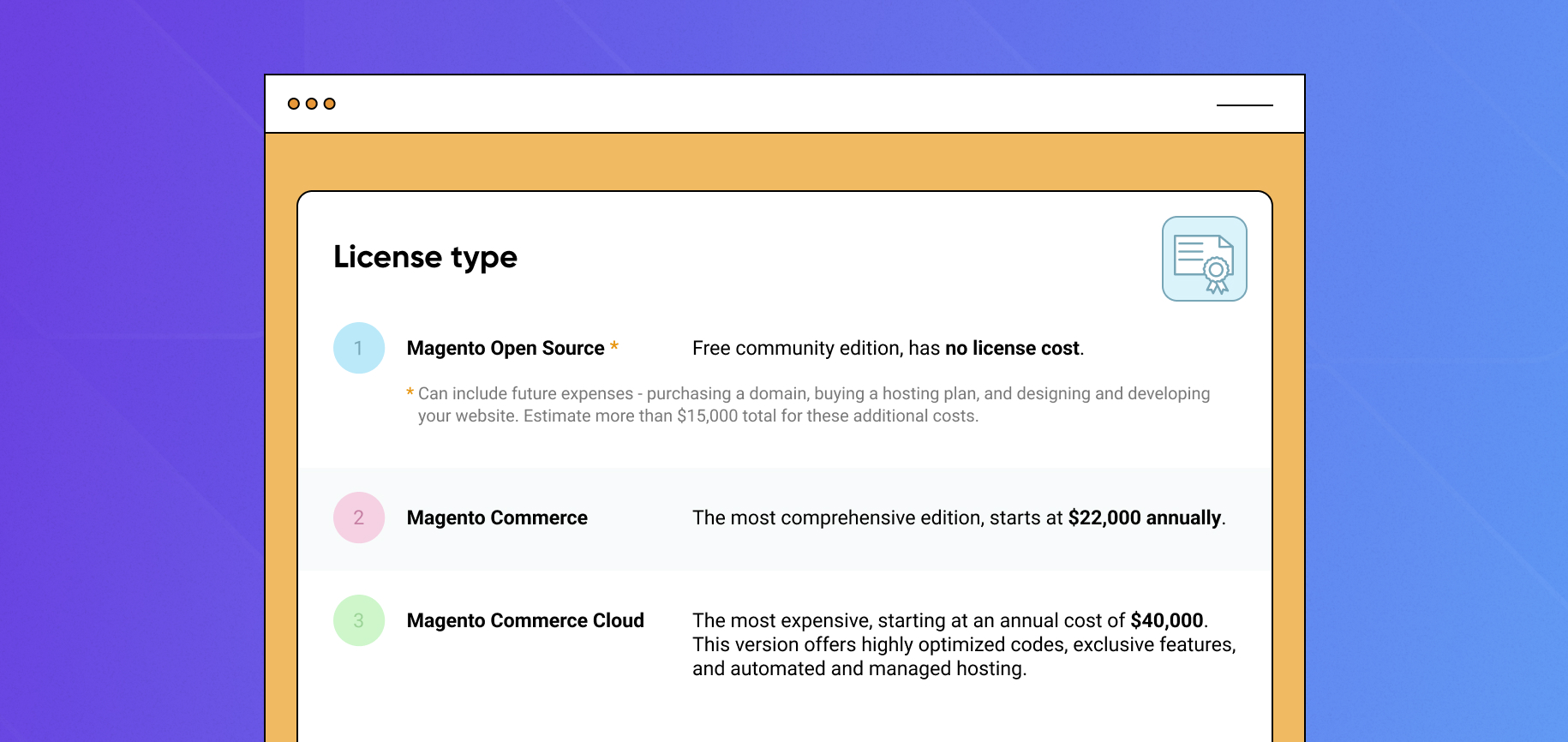 Tip: Although Magento Open Source has no upfront license cost, plan your budget to include future expenses associated with building your e-commerce store and making it live. These costs include purchasing a domain, buying one of the Magento hosting plans, implementing the design and developing your website. Plan more than $15,000 total for these additional costs.
