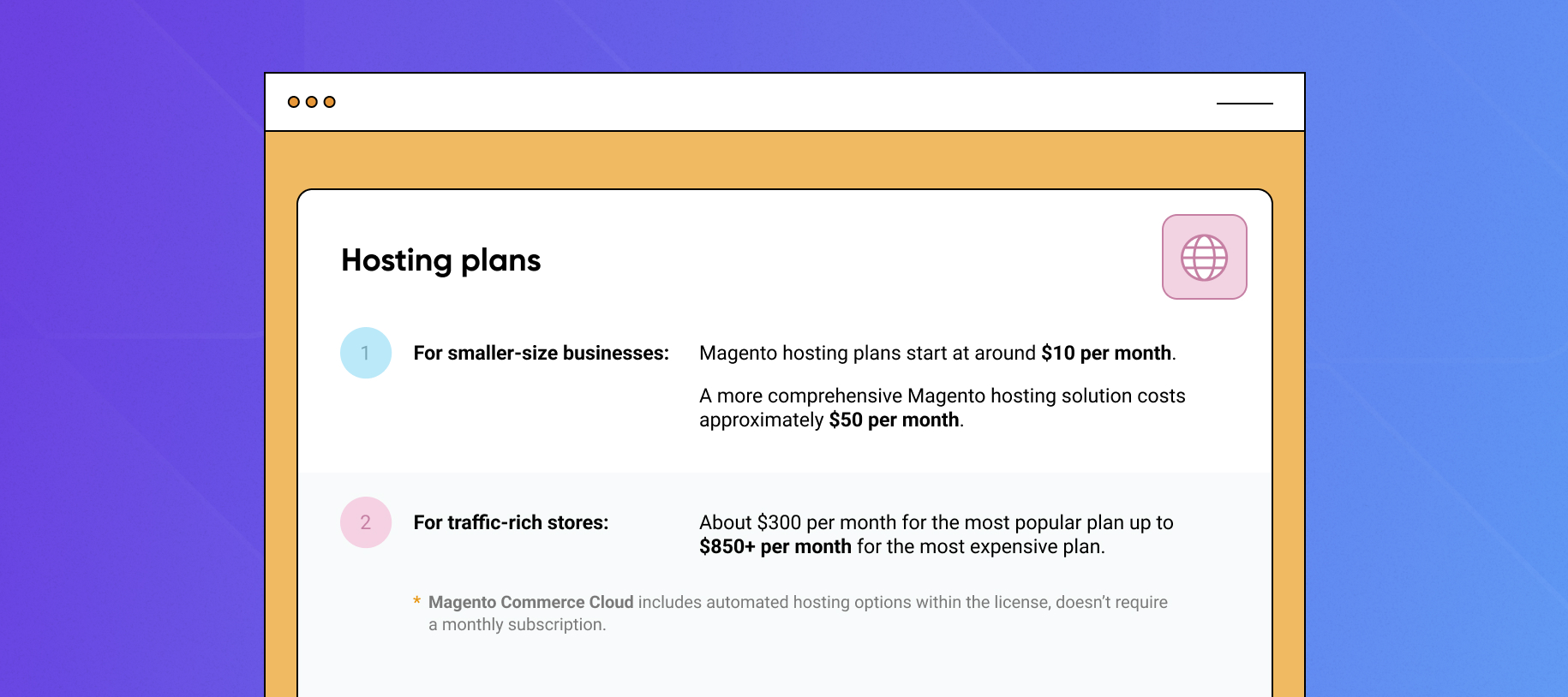 While Magento hosting plans start at around $10 per month, more comprehensive Magento hosting costs approximately $50 per month.