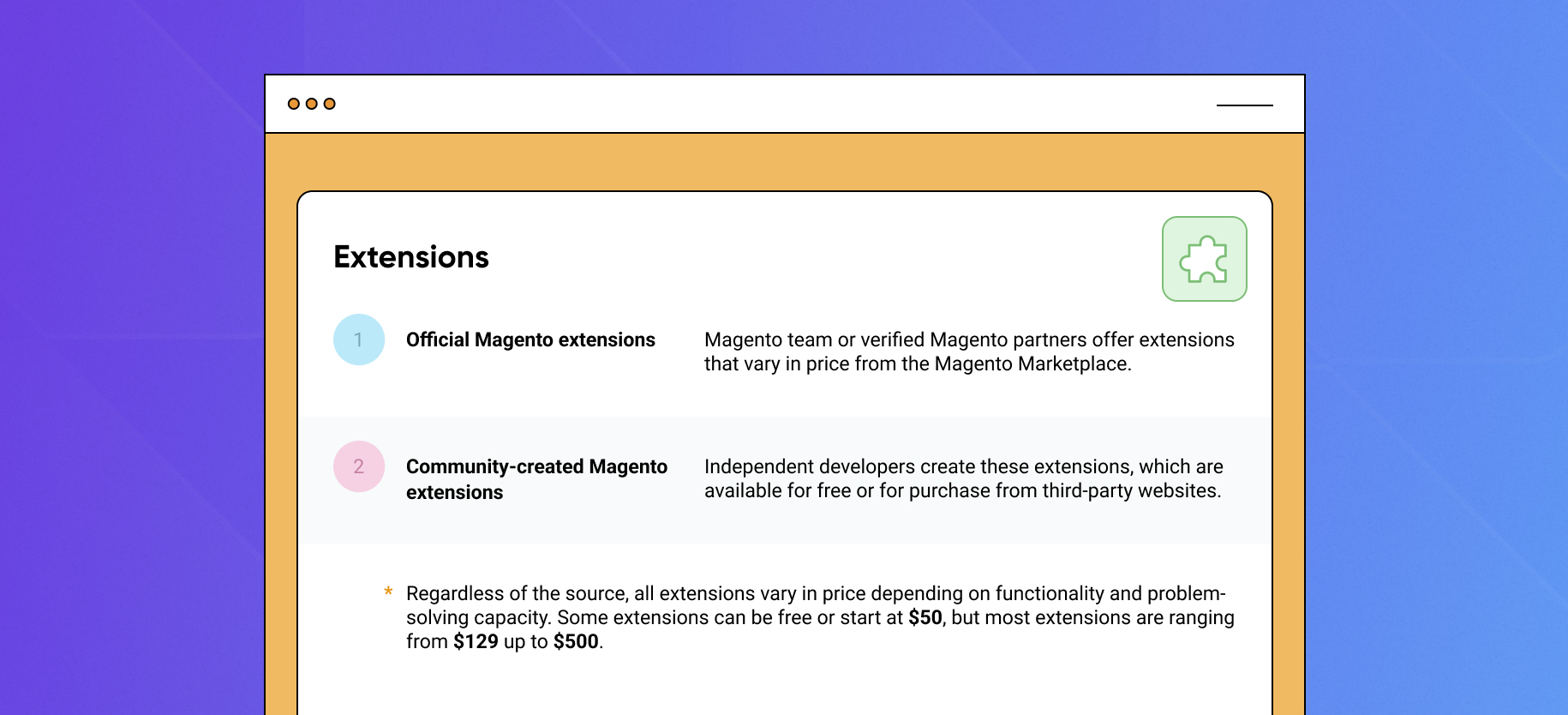 - Official Magento Extensions: The Magento team or verified Magento partners offer extensions that vary in price from the Magento Marketplace.