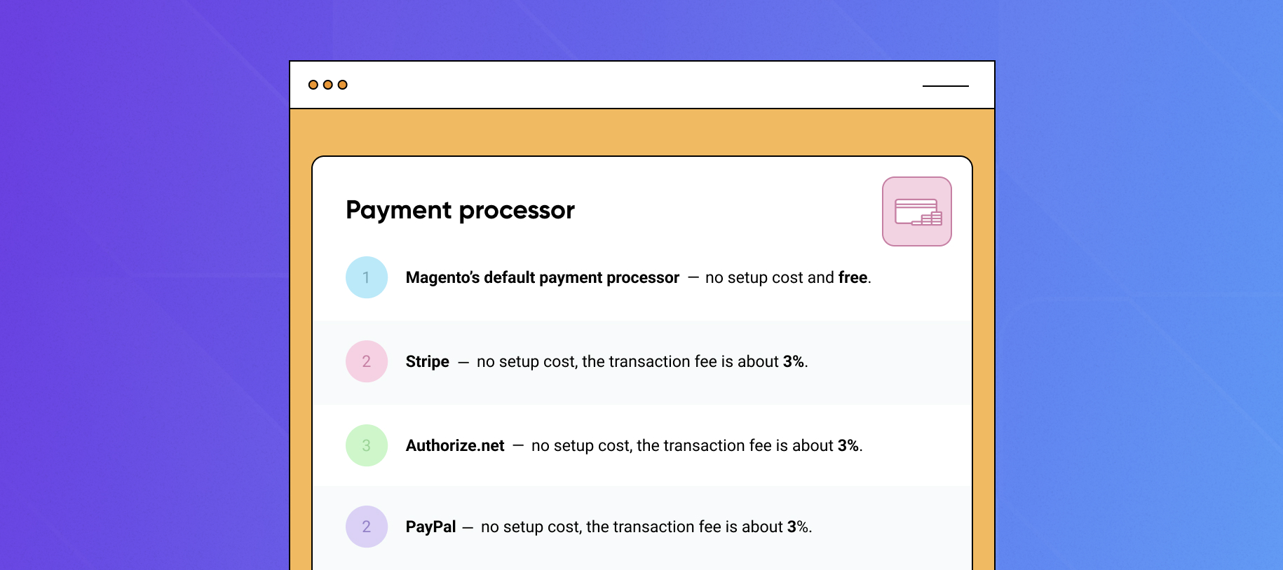 One way to reduce costs is to choose a payment provider that doesn't charge fees. Magento’s default payment processor is an excellent option if you're just starting with the platform. It's easy to use and already set up for you. Plus, it's free to use.
