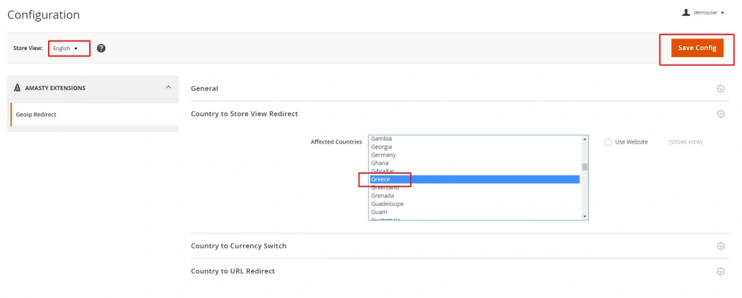 This way, customers from Greece and Iceland will be redirected to the English store view. Also, beware of selecting countries more than in one store view. For example, if you pick Austria in both German and English store views, the system will redirect users to stores at random.