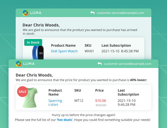 Get the Magento 2 notifications about ‘back in stock’ requests with the next values: the quantity of stock subscriptions created, the quantity of stock alerts sent, the amount of money you get from the notifications sent. The data presented on the dashboard also can be filtered by dates.