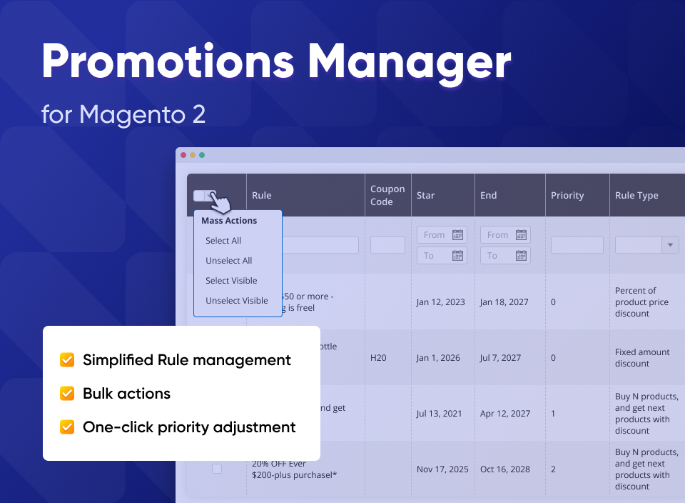 Simplify promotion management process with the expanded price rules grid. Now you can cut the time on promotion-related tasks by using additional actions and columns.