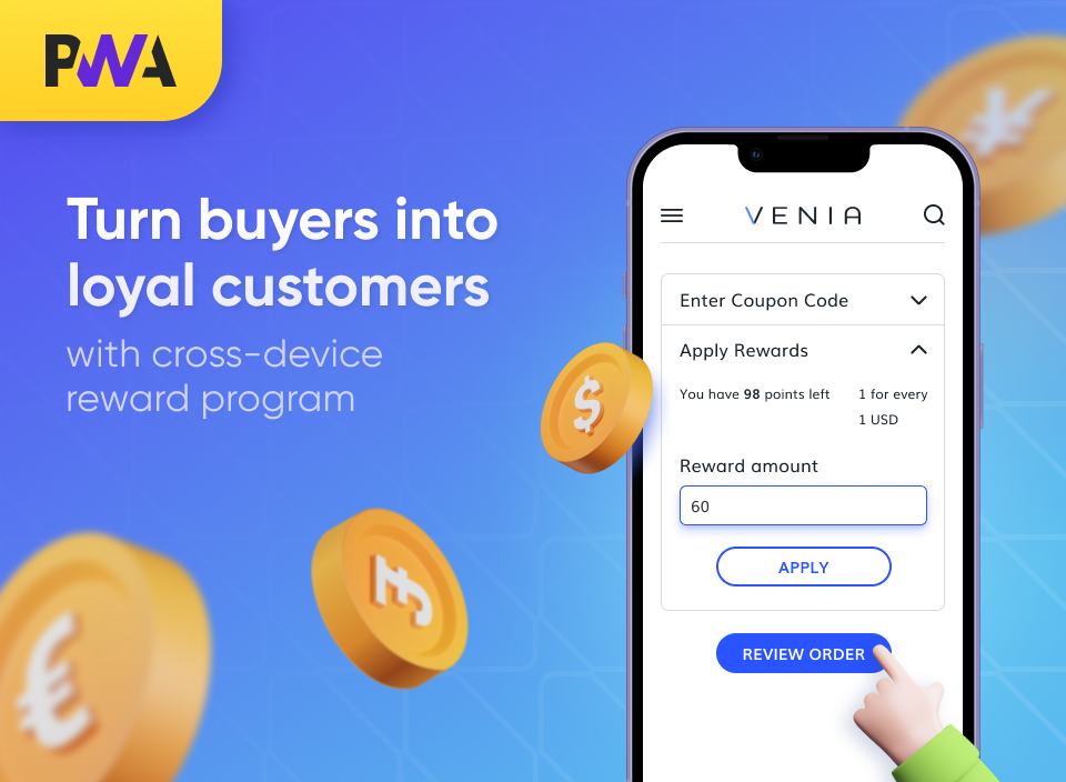 Provide an engaging reward program on any device to delight customers and increase their loyalty using PWA for Reward Points.