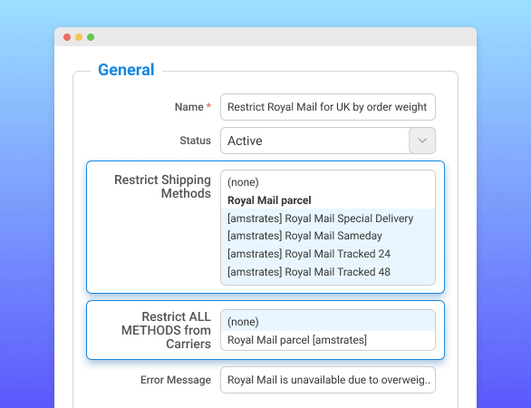 Once you have created a custom shipping method you can flexibly modify it according to your business needs using the Shipping Rules and Restrictions tools. Set rules and restrictions based on product, cart, and customer attributes. Restrict or hide the existing carriers and methods if necessary. Customize shipping rates using a variety of conditions. Apply additional delivery options to surcharge, discount, or replace shipping rates. The extension will help you to make the Magento shipping integration process both legal and cost-effective.
