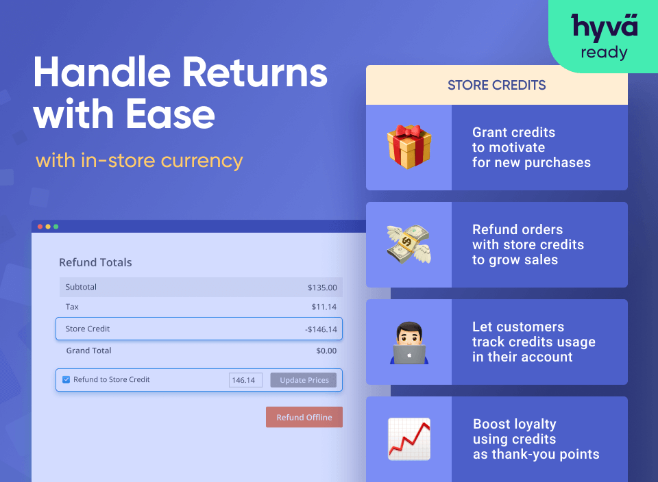 How? Try the Store Credits and Refund extension, which offers a feature of Magento 2 Commerce — Store Credits. It is a virtual currency that allows merchants to handle returns without actually paying back real money. Customers will receive store credits that can be used towards their next purchase. It’s a win-win situation: you keep both customers and your profit margins happy.